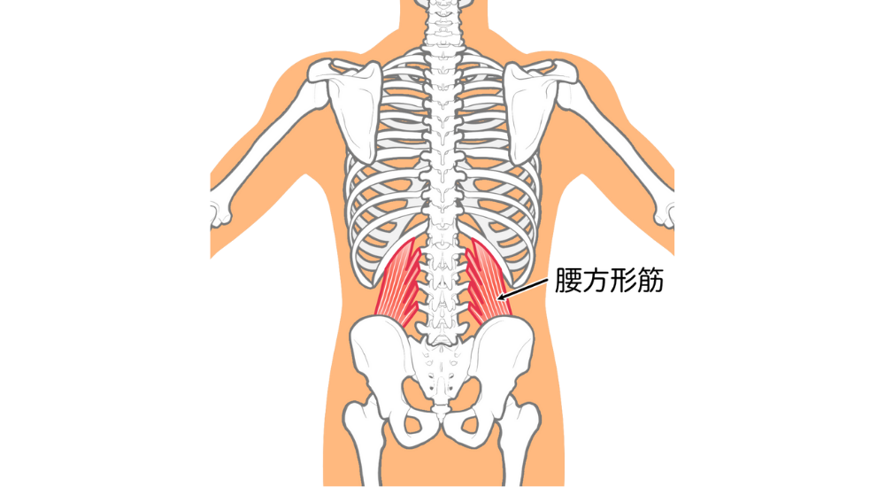 腰の深部にあり、体幹の側屈や安定に関わる。左右のバランスの崩れや不良姿勢で負担がかかりやすいです。